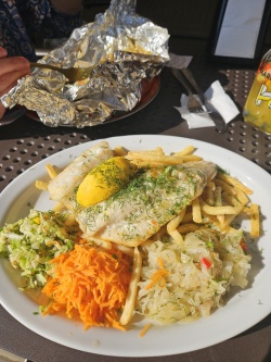 Przepyszny obiad. Zamówiliśmy pieczonego sandacza z frytkami, bukietem surówek i sosem cytrynowym oraz dorsz w stylu Słonej Zatoki, zrobiony w stylu azjatyckim. Wszystko bardzo dobre i świeże. Porcje odmierzone, więc nie ma zaskoczeń przy opłacaniu paragonów. Jest samoobsługa przy płaceniu, przynoszeniu dań i odnoszeniu talerzy, ale mi to zupełnie nie przeszkadza. Na pewno wrócimy.
